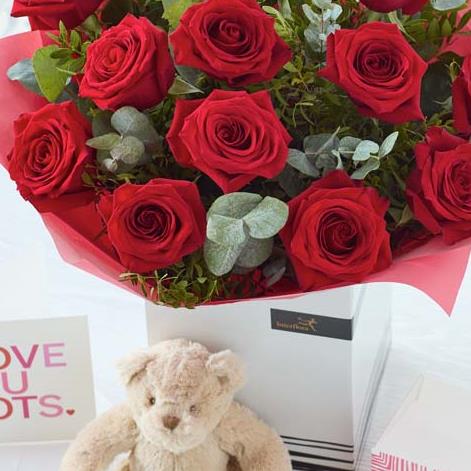 A classic dozen luxury red roses, plus an adorable teddy bear, scrummy chocolates and a card too – this one ticks every single Valentine's box, they're going to love it