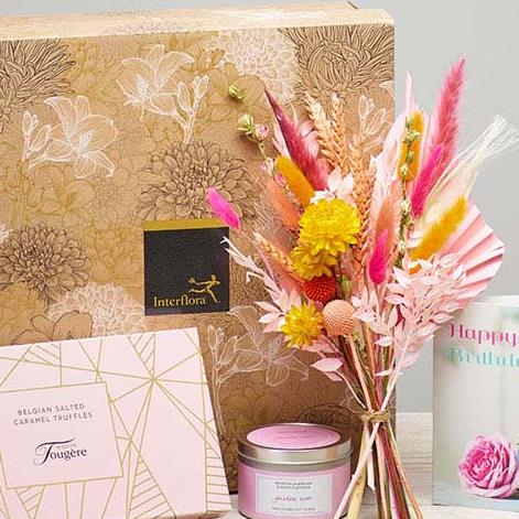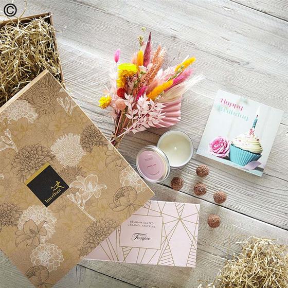 A proper birthday treat, this gorgeous gift box includes scrummy salted caramel truffles, a Garden rose scented candle, and an extra cute cupcake card. It also comes with a selected of pretty pastel dried flowers, chosen by a florist.