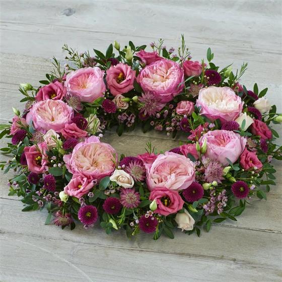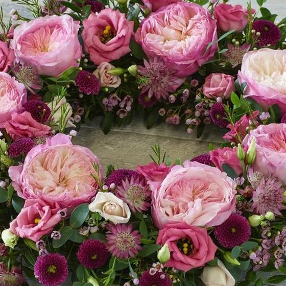 A beautiful wreath of pink tones featuring stunning garden roses, delicate astrantia and elegant foliage.