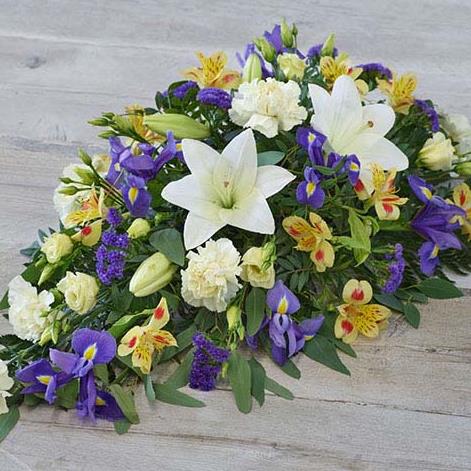 One of our most popular designs, this teardrop shaped arrangement features stunning lemon and blue blooms including irises, lisianthus, and alstroemeria.