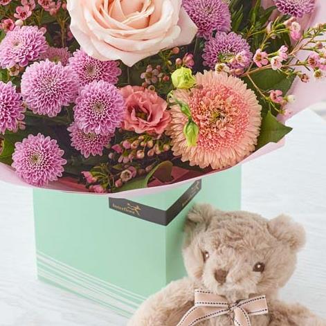 Each and every hand-tied in our New Baby Gift Set is one-of-a-kind, created by an artisan florist using the freshest stems available on the day so, whilst your bouquet will look different to the one pictured, it’ll still be just as lovely (plus it arrives accompanied with a hand-written gift card and an adorable teddy – what’s not to love?).