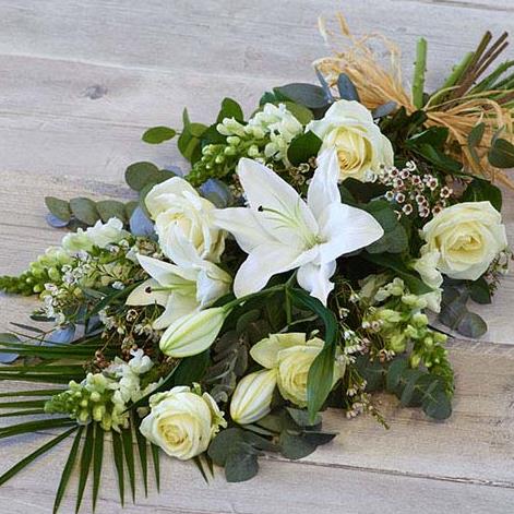 An elegant combination of fresh white tones and rich greens, featuring large ivory roses, oriental lilies, and silvery eucalyptus.