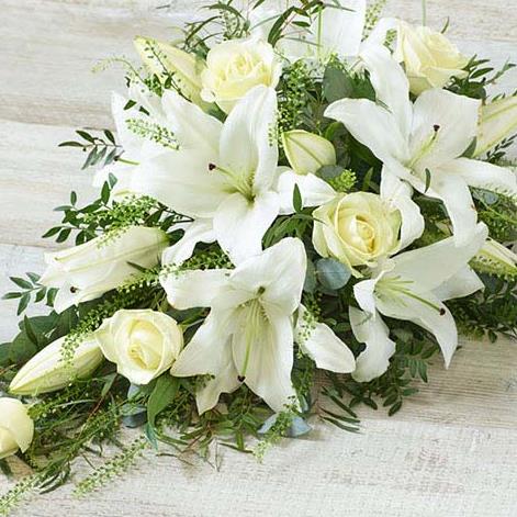 An elegant tear drop shaped arrangement featuring delicate foliage and large fragrant oriental lilies, combined with gorgeous roses.