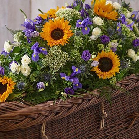 This casket spray is a beautiful summery mix featuring sunflowers, irises, spray roses and lush foliage.