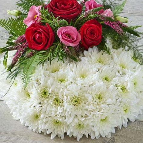 This posy features roses resting on a beautiful bed of white chrysanthemums.