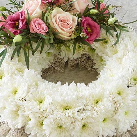 A traditional wreath of white chrysanthemums contrasted with a cluster of pretty roses, lisianthus and delicate foliage.