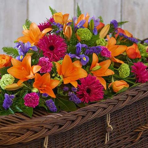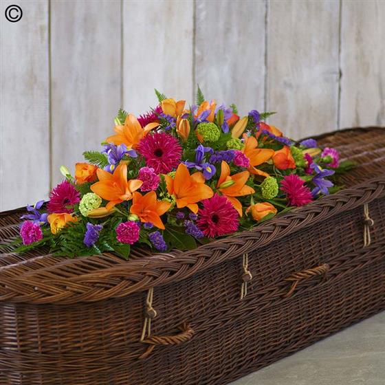 A casket spray of beautifully bright blooms including cerise carnations, orange roses and striking orange lilies.