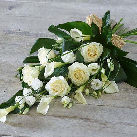 Graceful callas lilies meet large headed roses and rich green foliage in an elegant, neutral design.